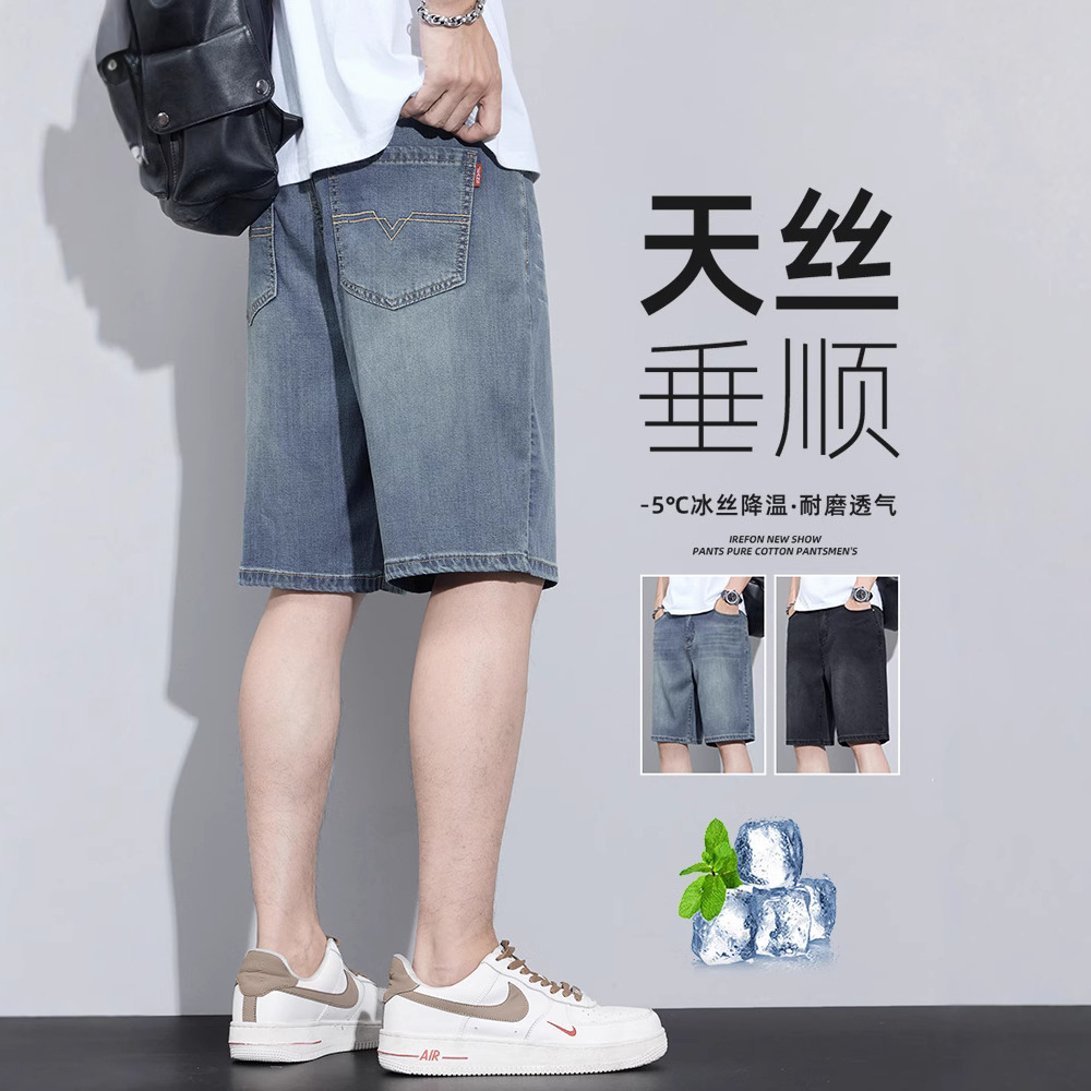 テンセルデニムショートパンツメンズ夏アイスシルク薄手2025新作ルーズストレート5点カジュアルミッドパンツ