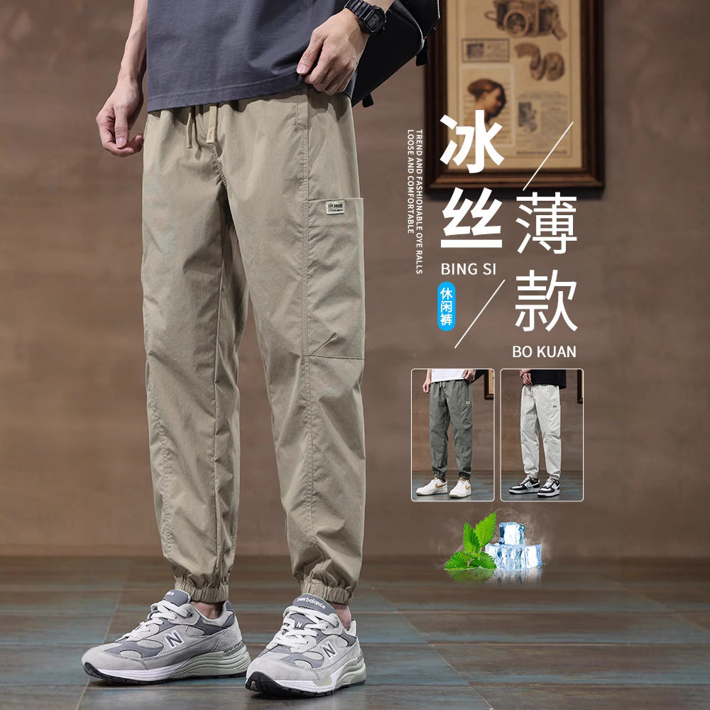 夏薄い9点カジュアルパンツ男の子用2025新しいスリムストレートメンズクールスポーツアイスシルクパンツ