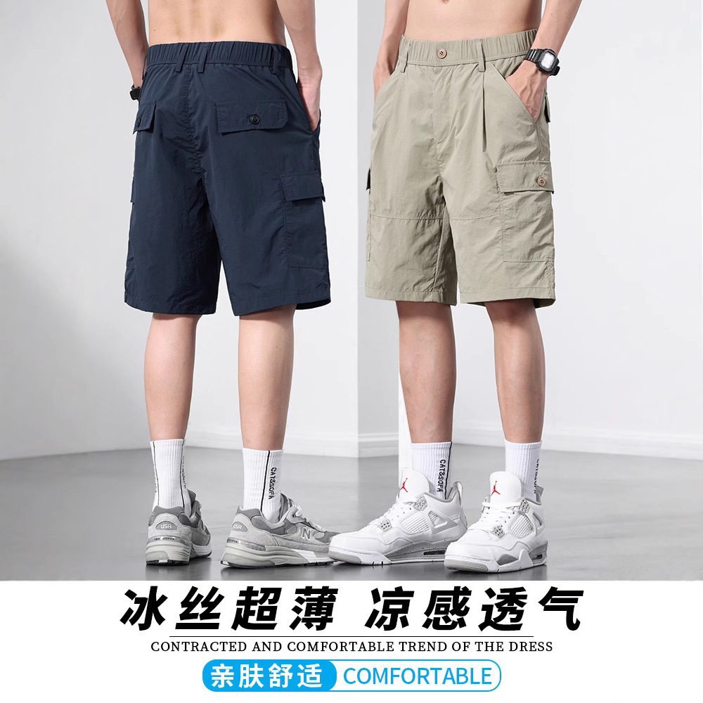 メンズカジュアルショーツ夏薄いストレートミッドパンツ紳士服ルーズサマーワークウェアアイスシルク5点パンツメンズ