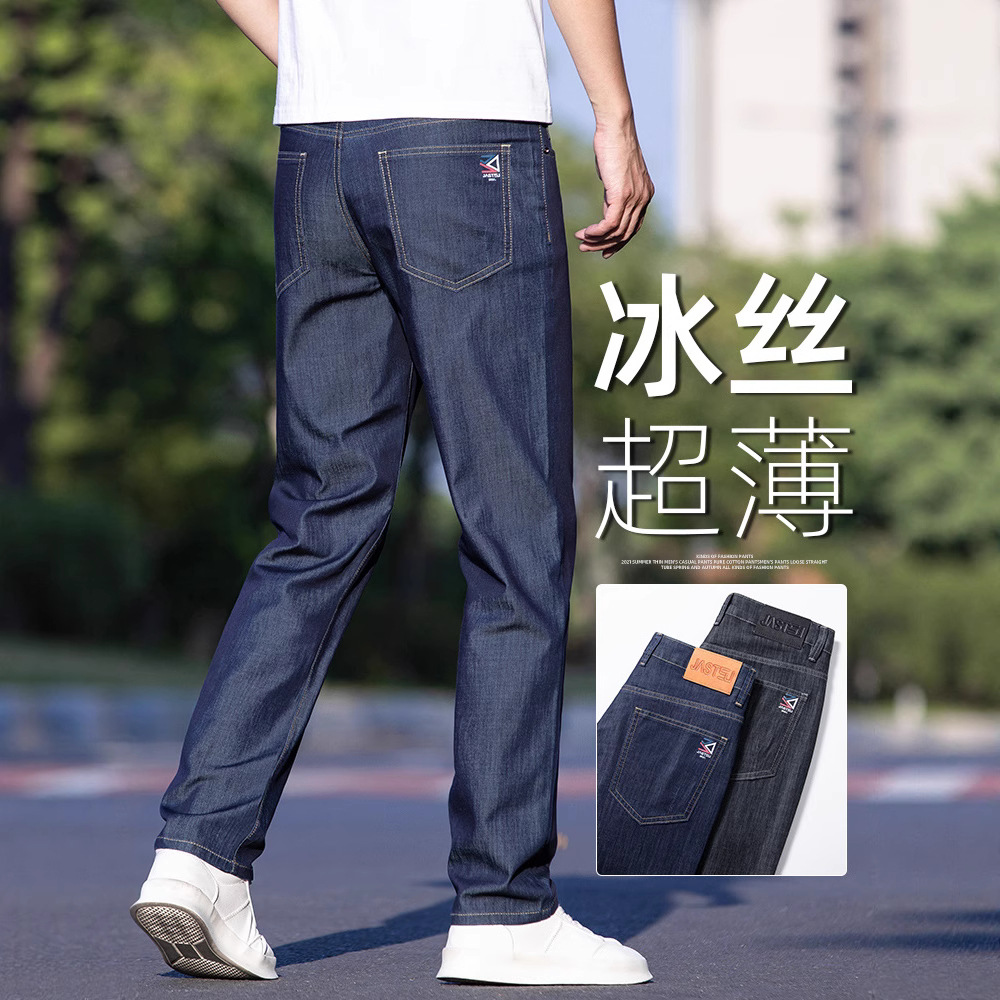薄いジーンズメンズルーズストレートアイスシルクビジネスパンツメンズ夏ストレッチお父さんカジュアルパンツトレンディ