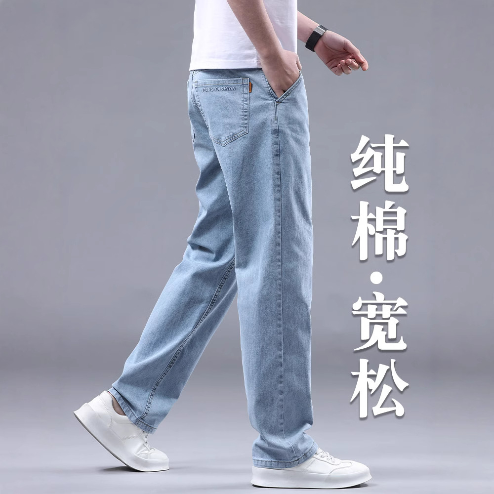 2025 新しいジーンズメンズストレッチ春と秋カジュアルロングパンツルーズストレートメンズパンツアイスシルク夏薄い
