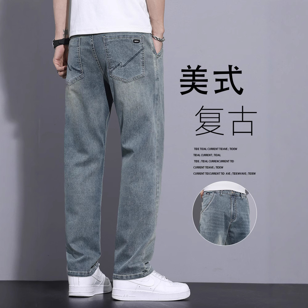 レトロジーンズメンズ薄型 2025 新しいトレンディなブランド夏ルーズストレート弾性カジュアルロングパンツ男性用