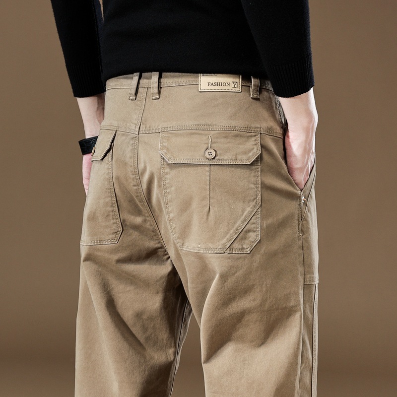 春秋メンズカジュアルパンツ、ゆったりストレートワークウェア、おしゃれで万能なストレッチパンツ、多ポケット付きメンズウェア