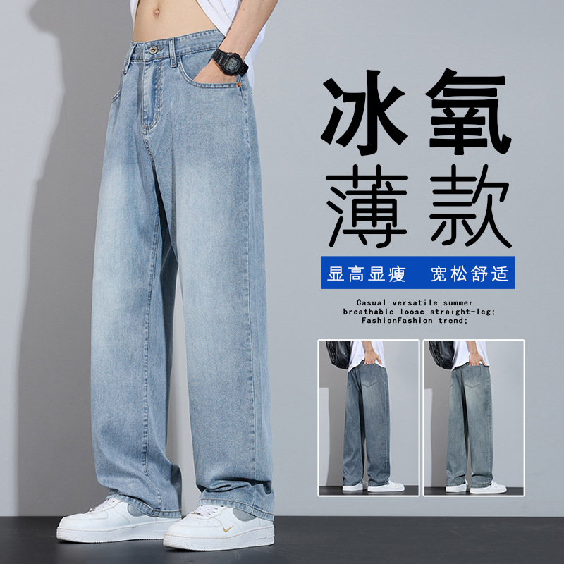 天糸ジーンズ男夏薄手2025潮牌ゆるいストレートカジュアル氷酸素バー氷糸広脚長ズボン