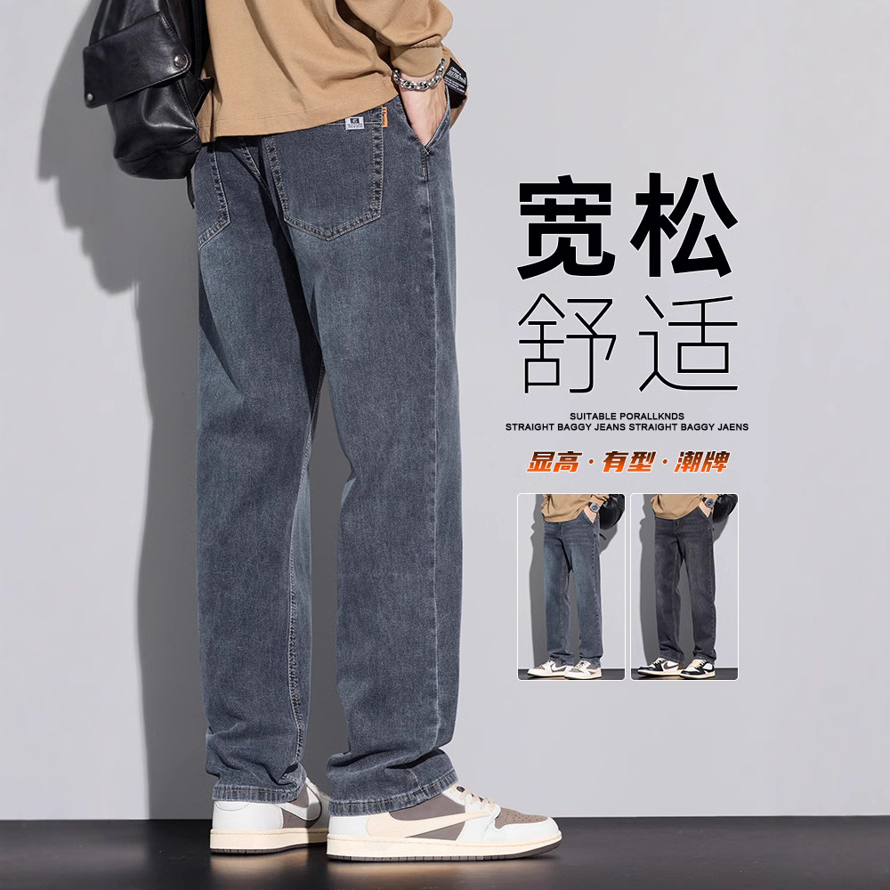 ストレートジーンズ男性春秋ゆるいカジュアルパンツ2025春の新型アメリカの高級弾力ズボン男性