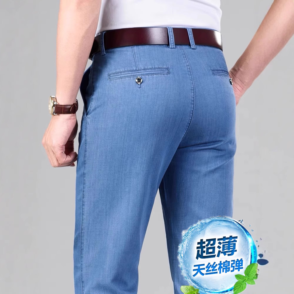 高級アイスジーンズ男性夏の薄いタイプのゆるいストレート中年のお父さんの天糸カジュアルズボン男性の夏のタイプ