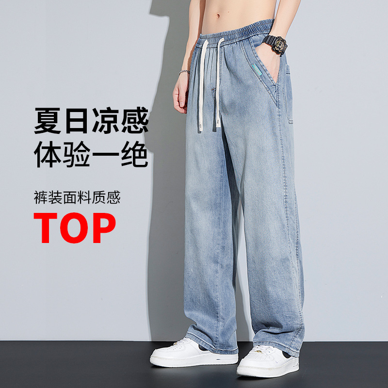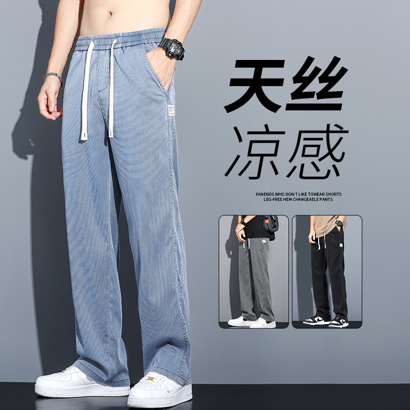 天糸ジーパン男性夏の薄金2024新型ファッションブランドの広い足の氷糸がゆるいストレートカジュアルなズボン