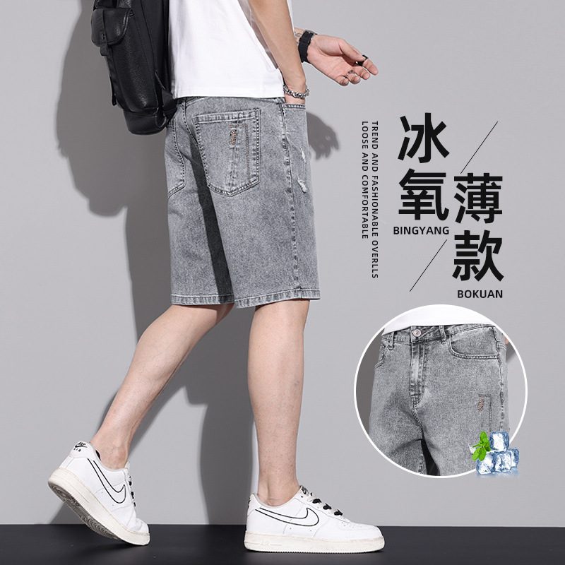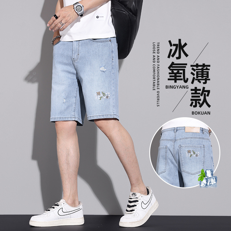 穴を割ったデニムショートパンツ男性2024新夏の薄いストレート5分ズボンのファッションブランドの氷糸カジュアルパンツ
