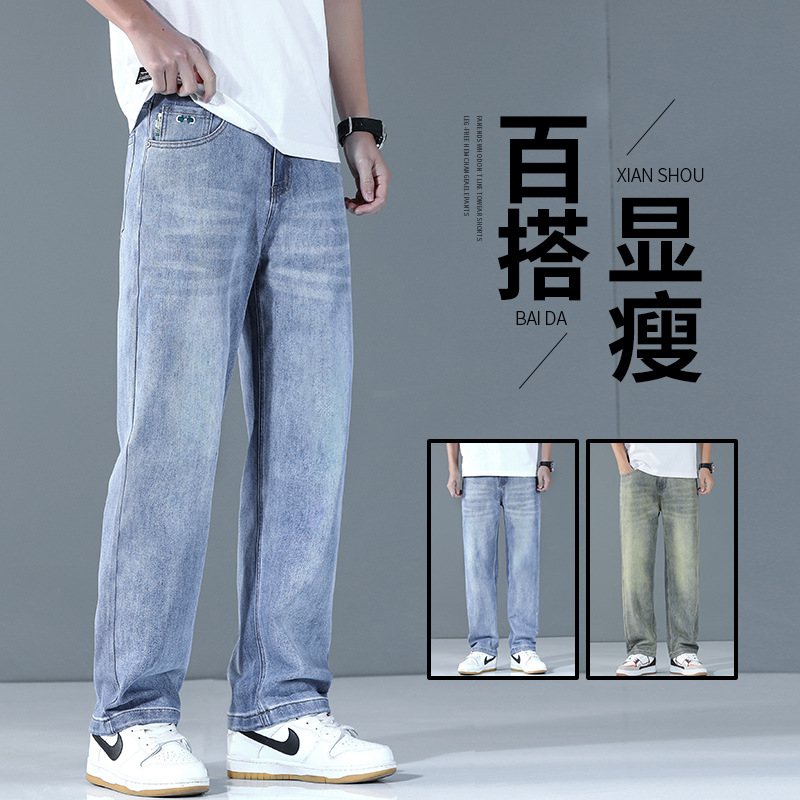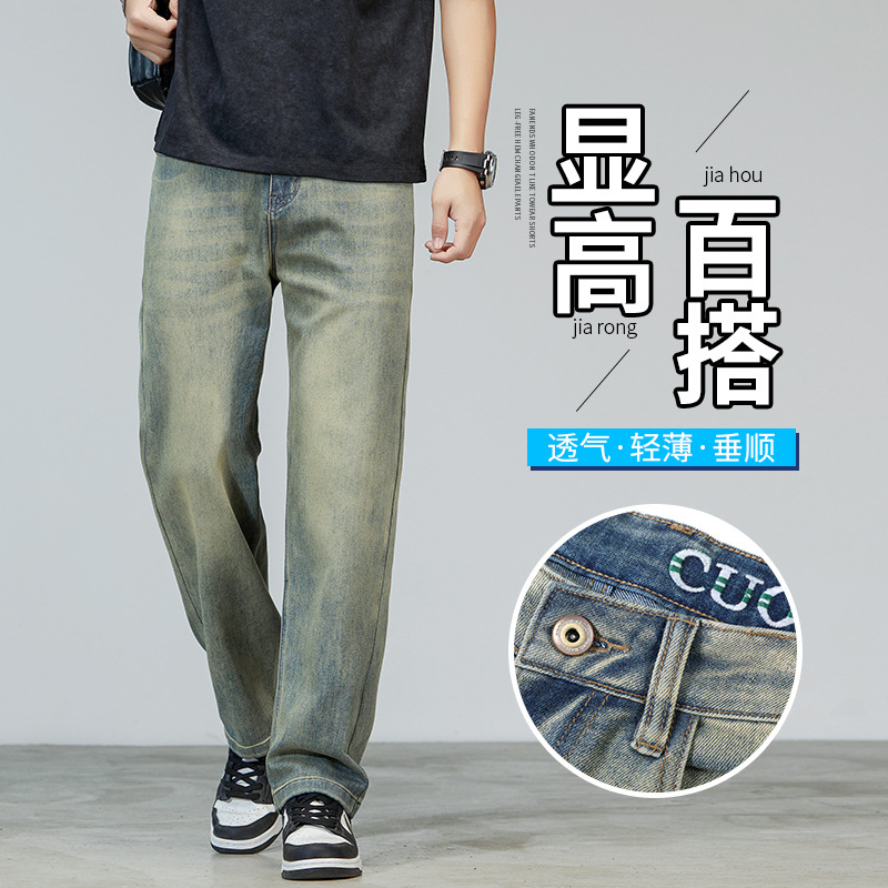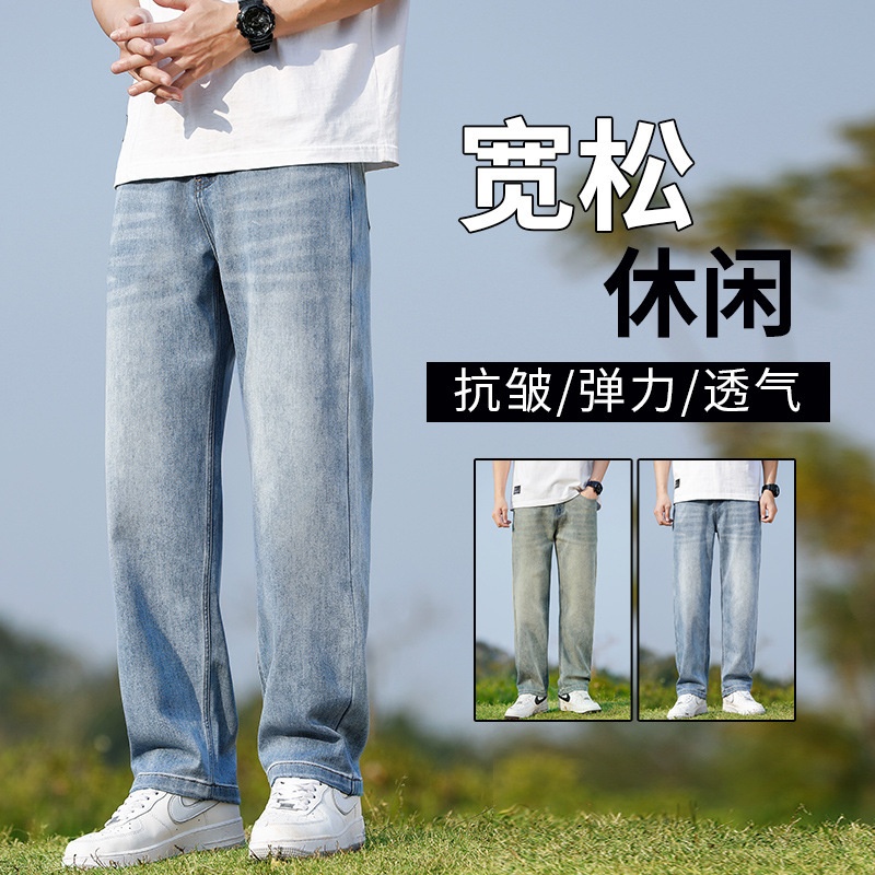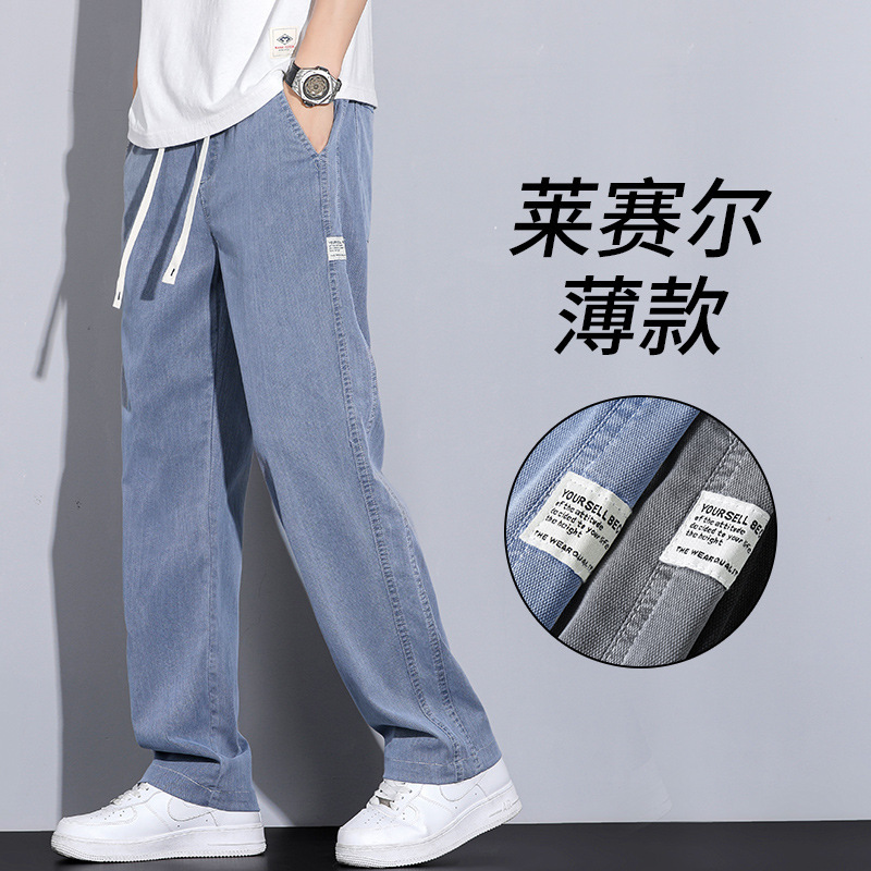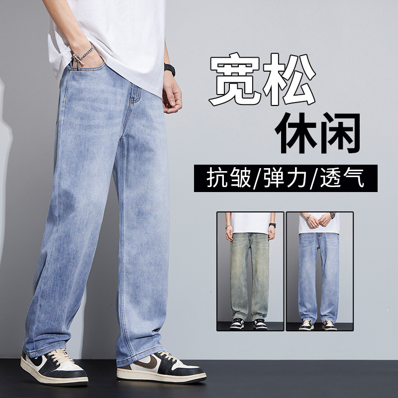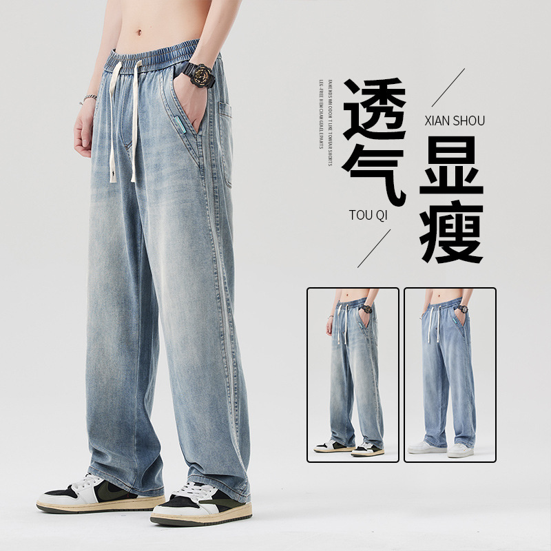 2024新型天糸ジーンズ男性夏の薄いストレートでゆるいアメリカの高街レトロなカジュアルズボンが湿っている