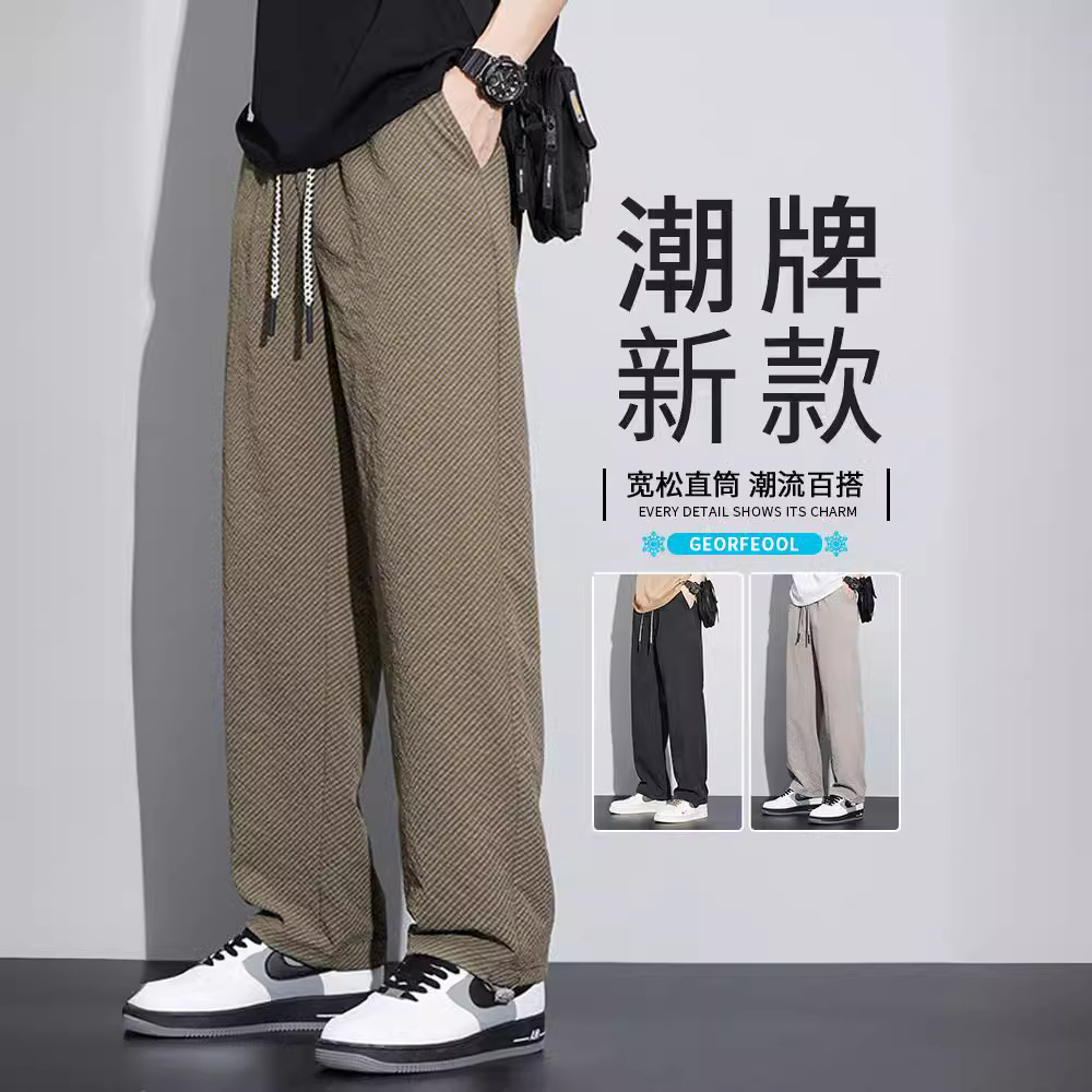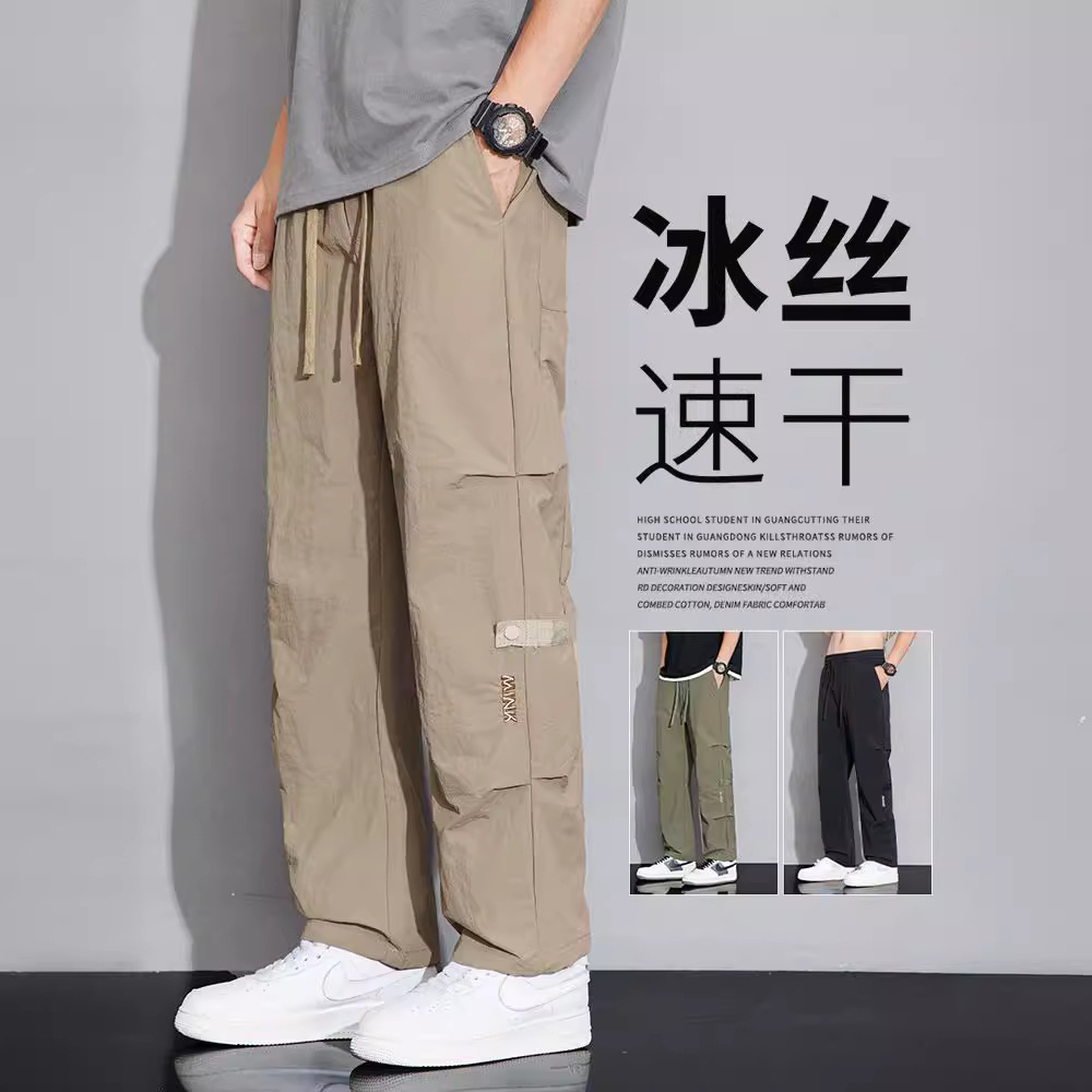 ストレートカジュアル男性夏の薄いタイプのゆったりしたアメリカのファッションブランドの氷糸ワイドパンツ2024新型スポーツ長ズボン