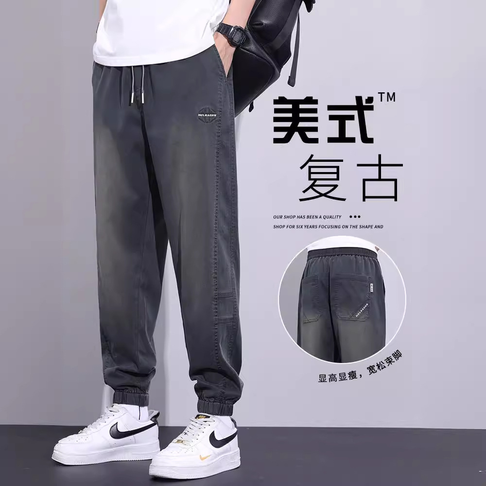 カジュアルなズボンの男性の氷の糸の潮のブランドの9分のゆったりしている束の足の運動の2024の新型の春秋の男子学生の夏の薄い金