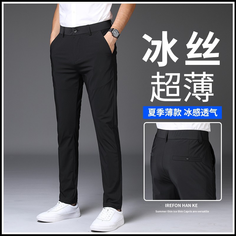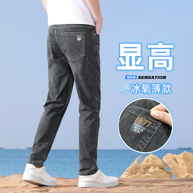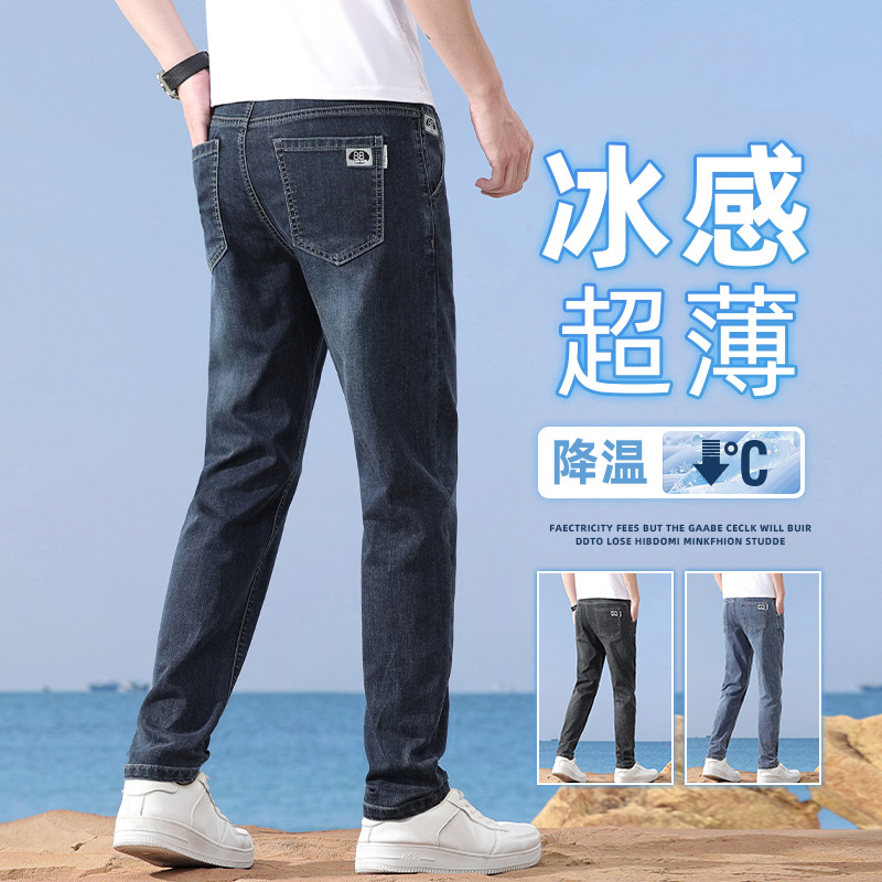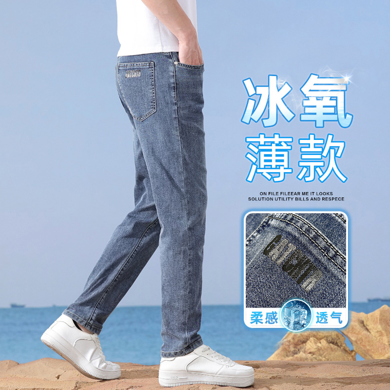 メンズジーンズ夏の薄いスリムなストレートの氷の薄い色のズボン2024の新型のファッションの弾力性のカジュアルなズボン