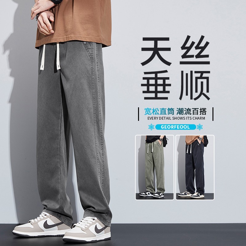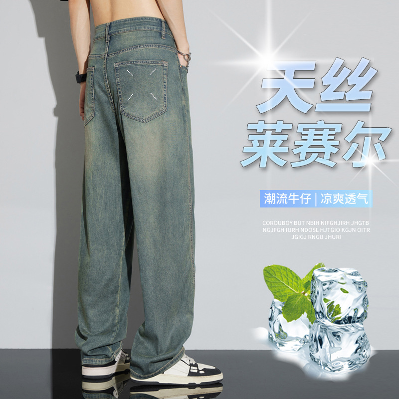 天糸ジーンズ男性夏薄手2024新型レトロ水洗いストレートゆるい氷糸広脚長ズボン
