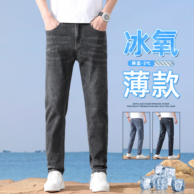 男性のジーパンの夏の薄いタイプのファッションのブランドのゆったりしたストレートのズボンの氷の酸素の通気性の弾力性のハイエンドのカジュアルなズボンの男性