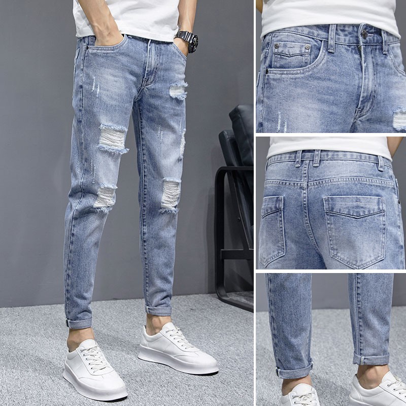 穴を割ったジーンズの男性は夏の9分でストレートパンツを修理してカジュアルな2024の新しい薄い乞食のズボンを緩めます。