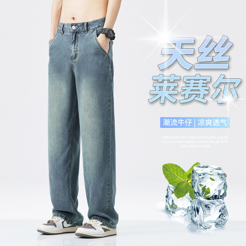 レトロなジーンズの男性の新しい天糸ストレートのゆるいズボン2024夏の薄いタイプのカジュアルなズボンの男性