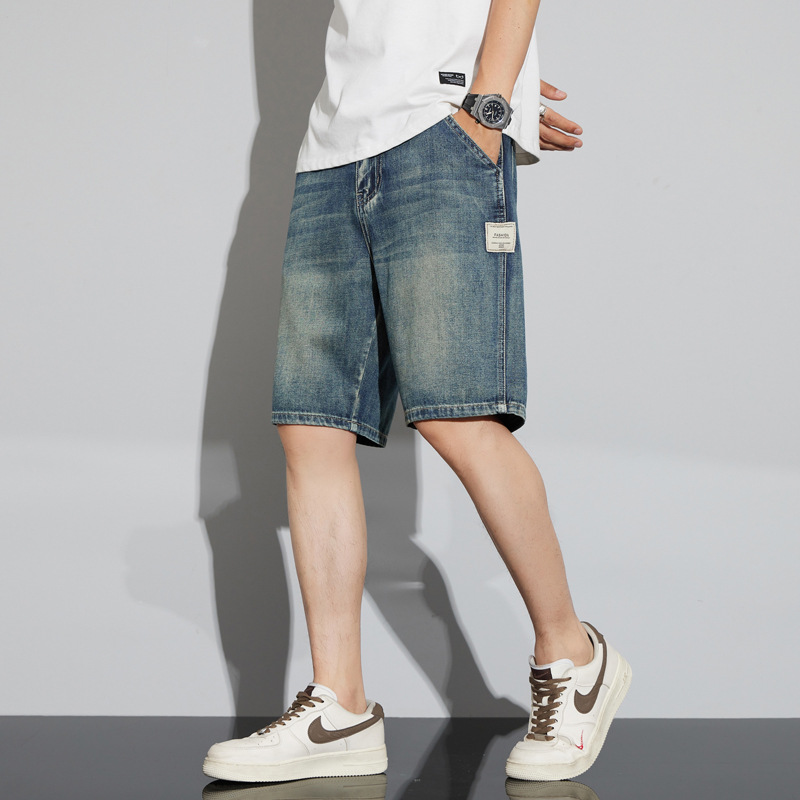 夏の薄いタイプの水洗いデニムの半ズボンの男性はゆったりしています。