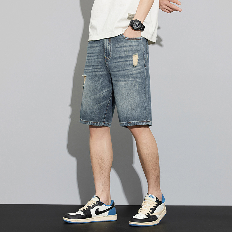 アメリカのレトロな穴が開いているデニムの半ズボンの男性2024は夏の薄いタイプのゆったりしている男性のカジュアルな5分の中ズボンを着ます。