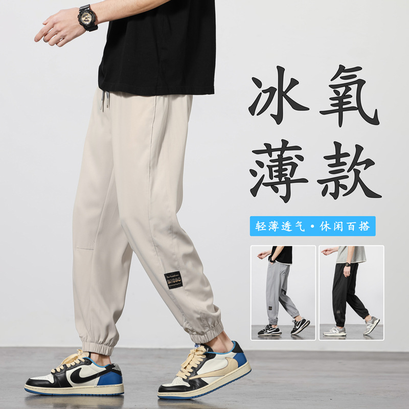 夏の薄いタイプの氷糸男ズボン夏の通気性運動レジャーズボン男性はゆったりと腰を締めて春秋タイプの春