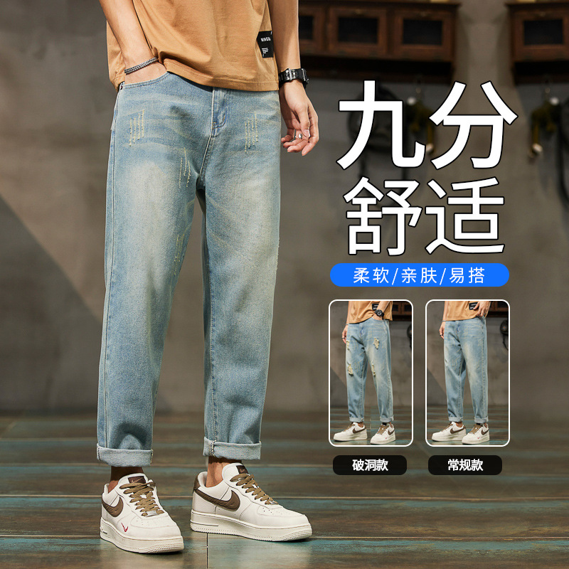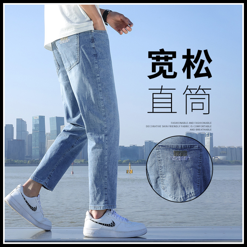 春の夏の9分のジーパンの男性の薄い色のカジュアルな百合2023の新型のごろつきのハンサムでゆったりしている直筒の長いズボンの男