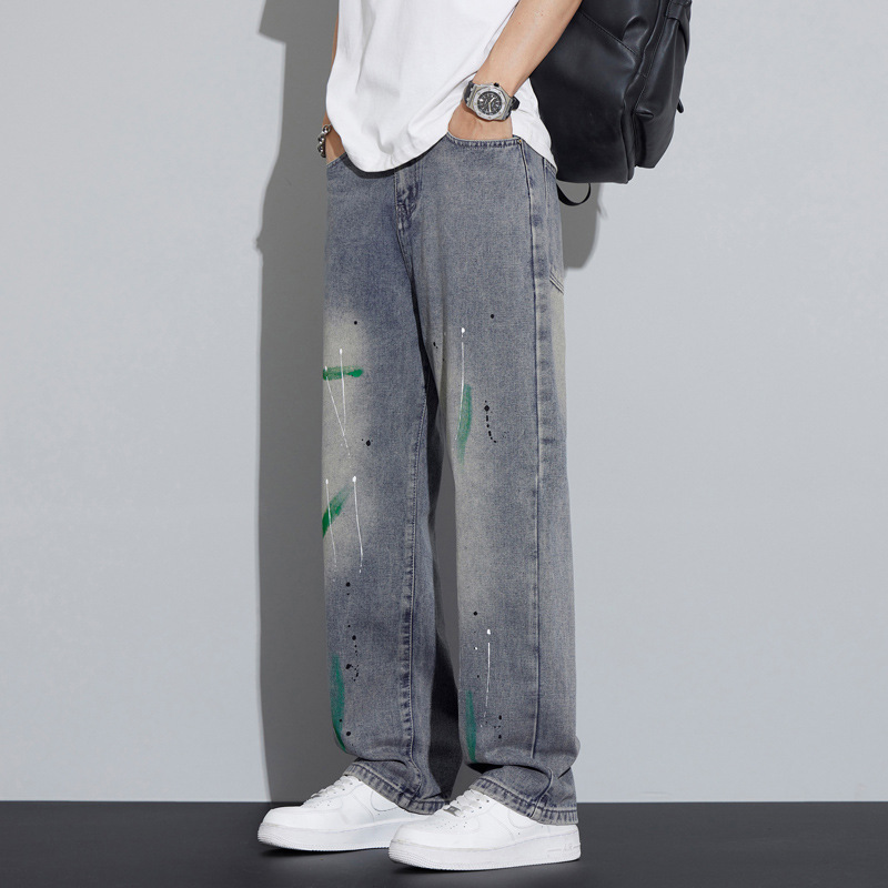墨をかけて落書きしたデニムのズボンの男性の2025年の春秋の新型の潮流は水洗いしてゆったりしています。