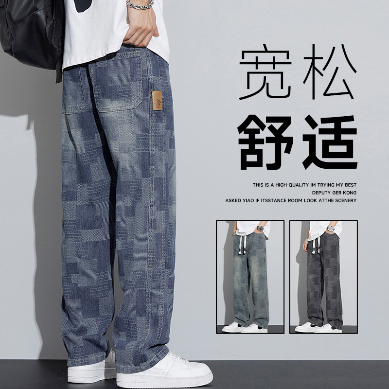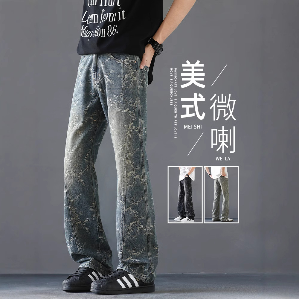 高街ジャカードジーンズ男性タイプ2025春夏アメリカ微ラッパcleanfit曲げナイフストレート男性ズボン