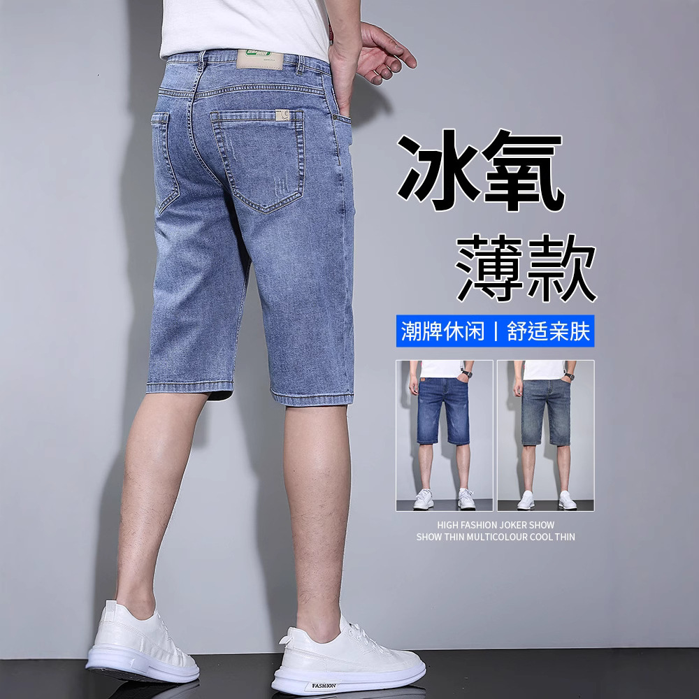 メンズデニムショートパンツ夏薄いトレンディなルーズストレートレッグ5点パンツウォッシュカジュアルミッドパンツ男性用ストレッチパンツ