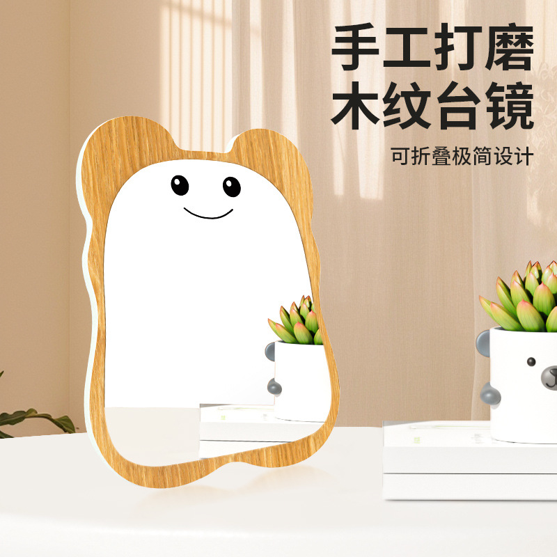 新しいかわいい人形木目調テーブルミラー女性の家庭用化粧鏡は、高精細化粧鏡を吊るして保管できます
