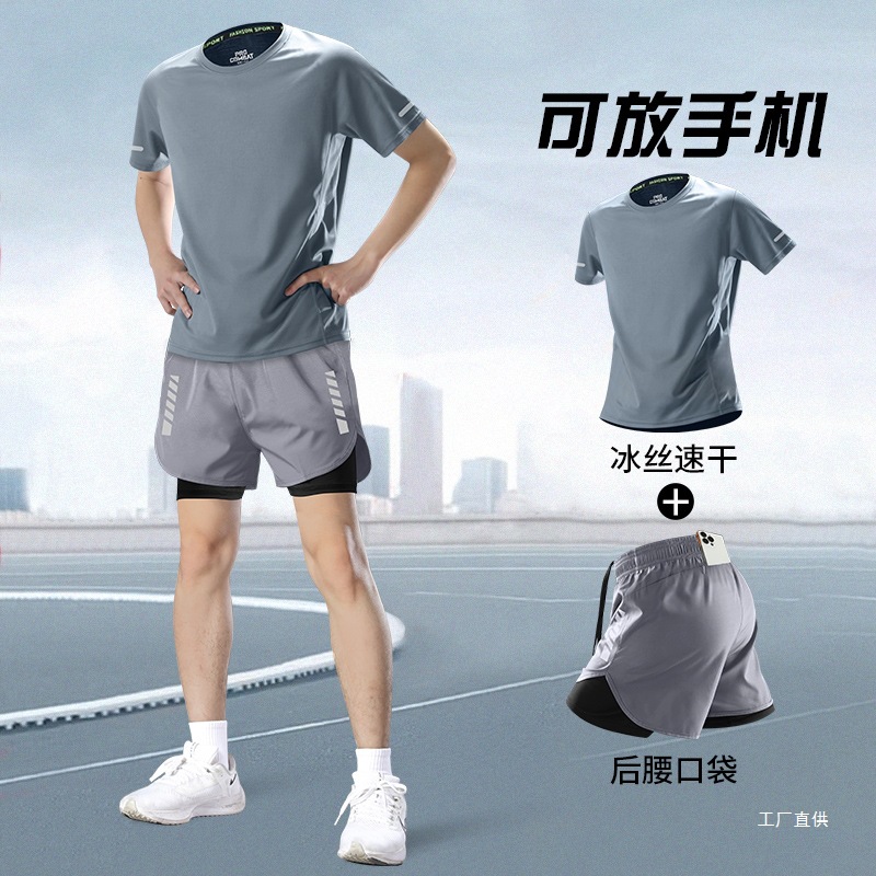 フィットネスウェアメンズランニングスポーツスーツ夏アイスシルク速乾半袖ショーツマラソンプロトレーニング展示