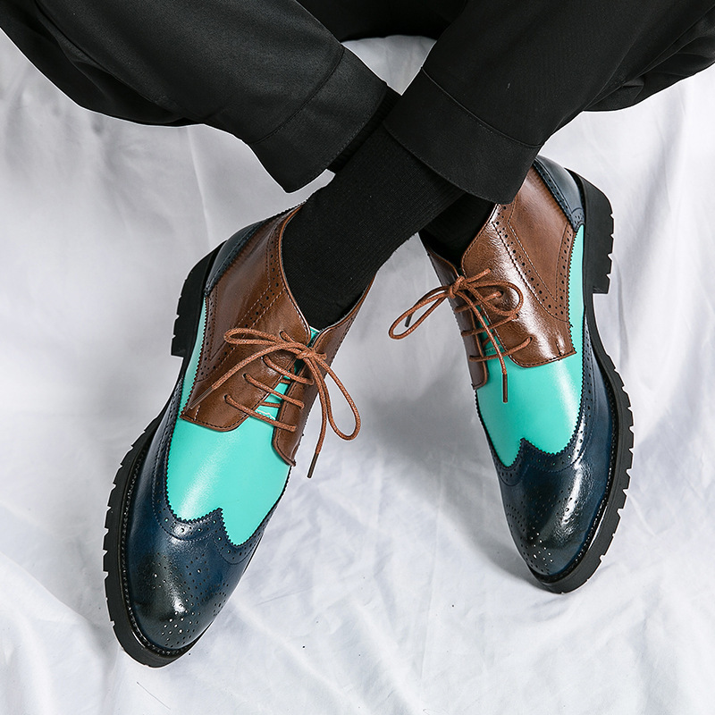 国境を越えた新しい先端ブロック靴韓国版の正装の色合わせ英倫ファッション休Genuine Leather