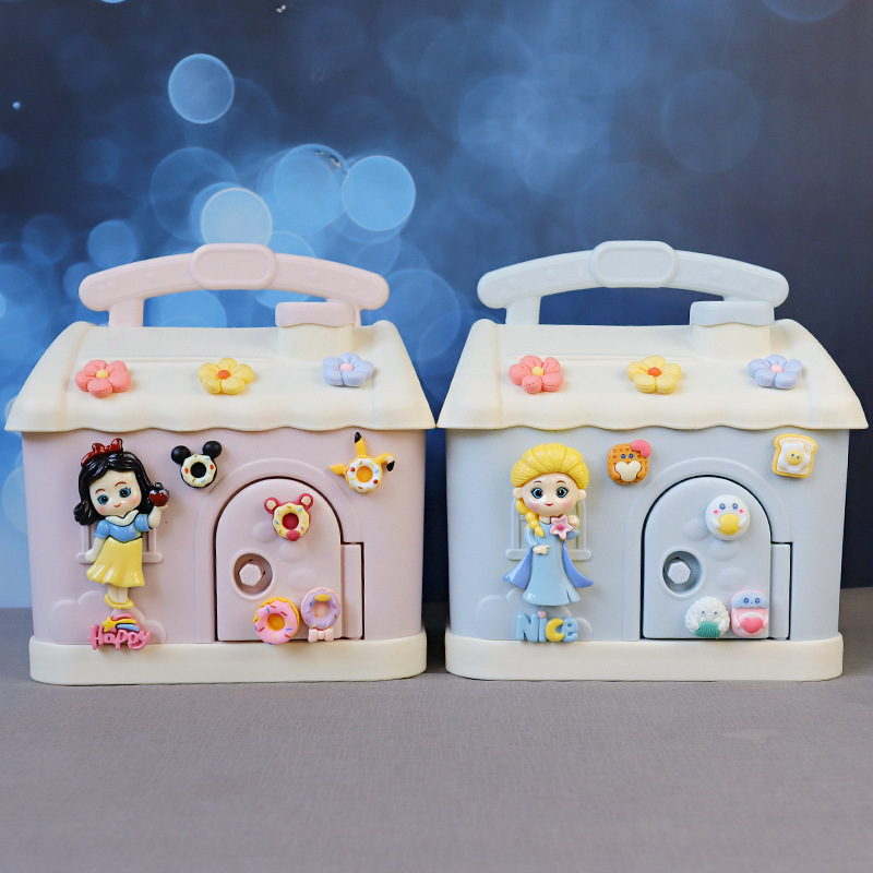 かわいい貯金箱の小さな家は男の子の誕生日の新年のプレゼントにアクセスできます。