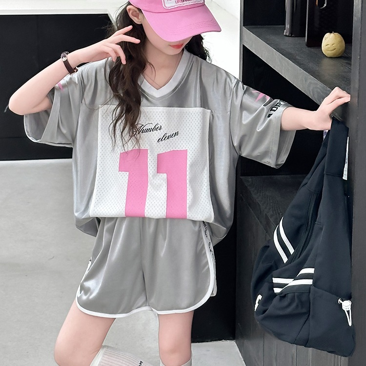 女の子の夏のアメリカンスポーツウェア、中型と大型の子供用ファッショナブルな速乾性ボールスーツ、ゆったりとした野球スーツ、2点セットのトレンディな服