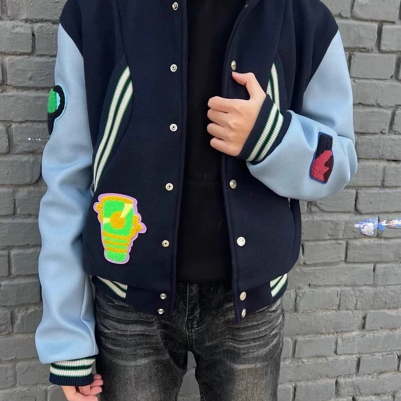 ブラックウッド秋冬キコ野球ユニフォームブルースリーブショートウエストハイストリートスリムバイブ男性と女性のクリーンフィットジャケット