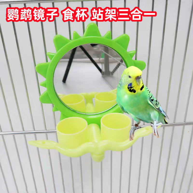 オウムのおもちゃの鳥は鏡で杯を食べます。