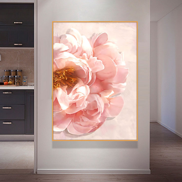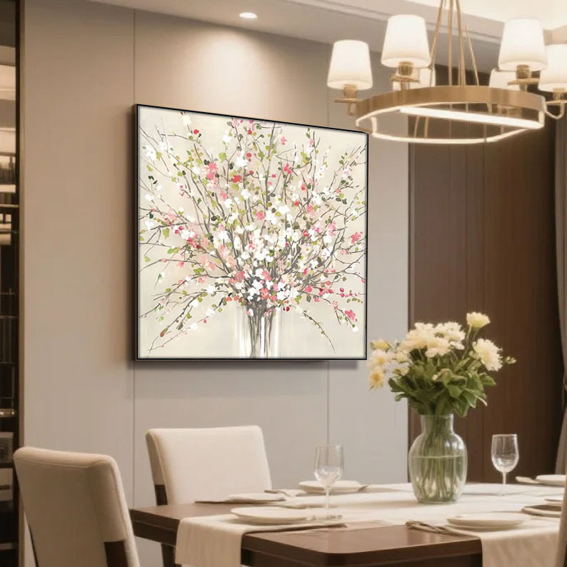 フレンチピンク花飾り画リビング玄関癒し系抽象花筋理油絵クリーム風掛け画