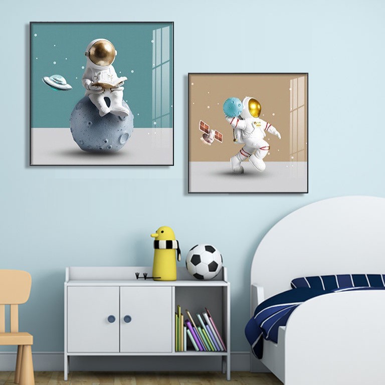 寝室のベッドの上の装飾画の宇宙飛行士は宇宙の漫画の子供の部屋の壁を漫遊して男の子の寝室の創意画を掛けます。