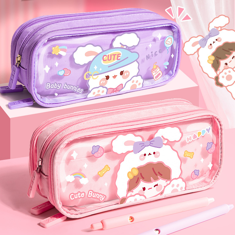 文房具ケース高颜値多机能キャンバス透明ペンバッグ中学生女子生徒大容量クリエイティブペンケース