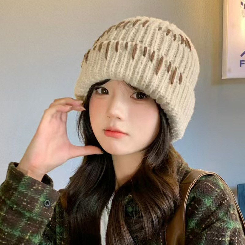 2024秋冬新作韓国版ライン帽子女性百合保温ニット帽学生が顔を見せています。