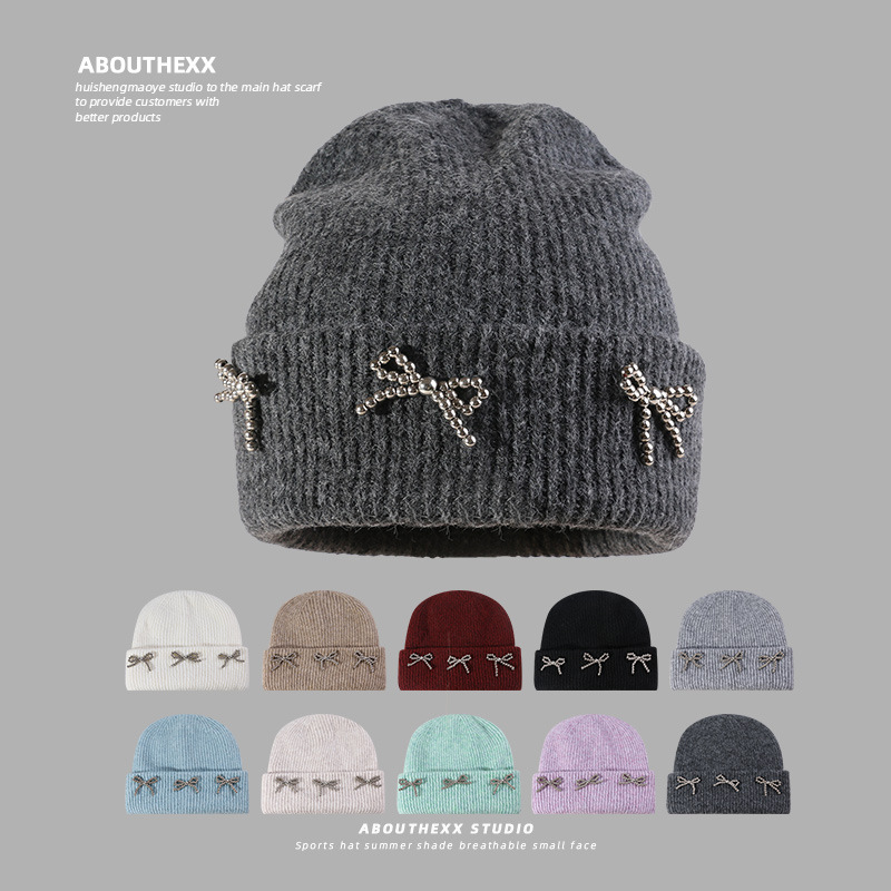 韓国版の小衆の真珠の蝶結びのニットの帽子の子供は大きい頭を合わせて顔の小さい冷たい帽子のゆったりとした頭の帽子の潮を現します。