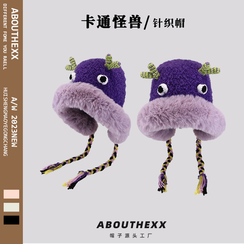 日本系アニメの小怪獣毛糸帽子女性秋冬手作りのかぎ針編みのぬいぐるみニット帽保温耳保護帽子