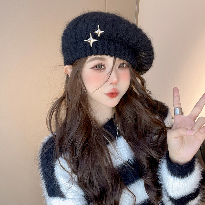 日本系馬海毛星ニットベレー帽女性秋冬保温ぬいぐるみ帽子