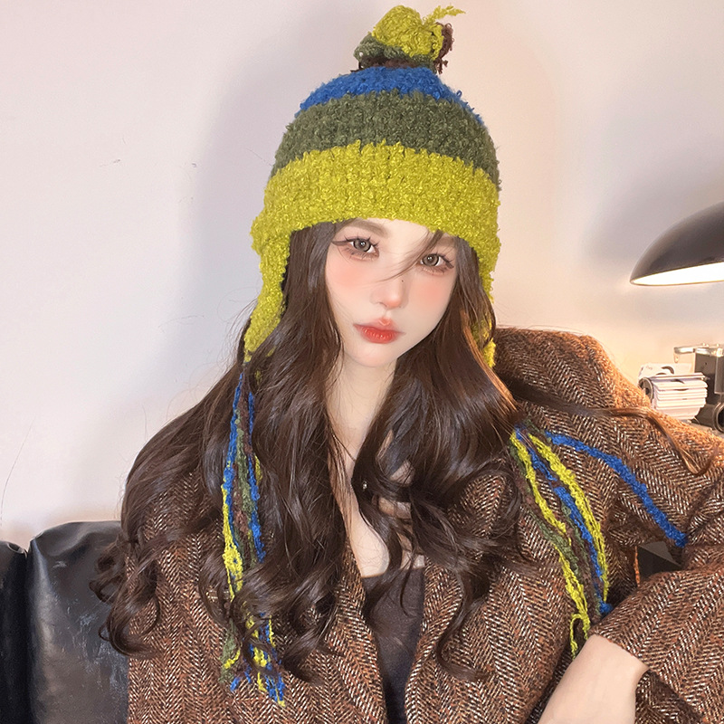 レトロなドーパミンカラー毛糸帽秋冬保温ニット帽のストライプ
