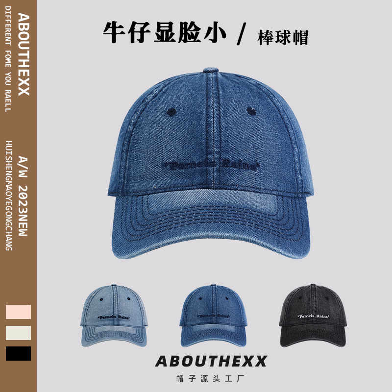 欧米の街のレトロな水洗いは古いデニムの野球帽をします。