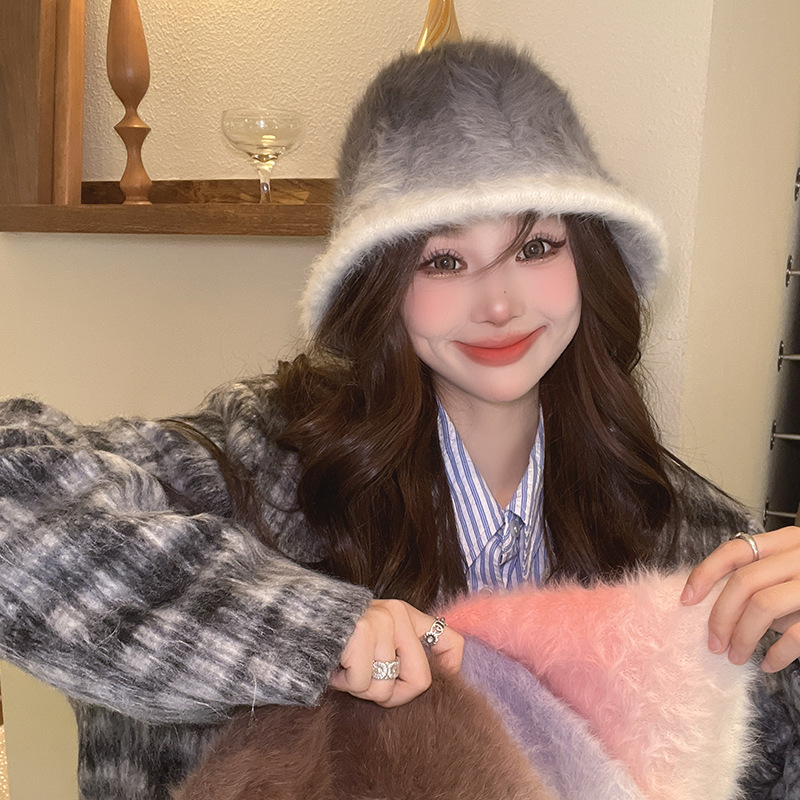 大きい頭の周りの漁師の帽子の女性の秋冬のグラデーション色のウサギの毛のバケツの帽子の子供の韓国版の百合のぬいぐるみは顔の小さい盆の帽子を現します。