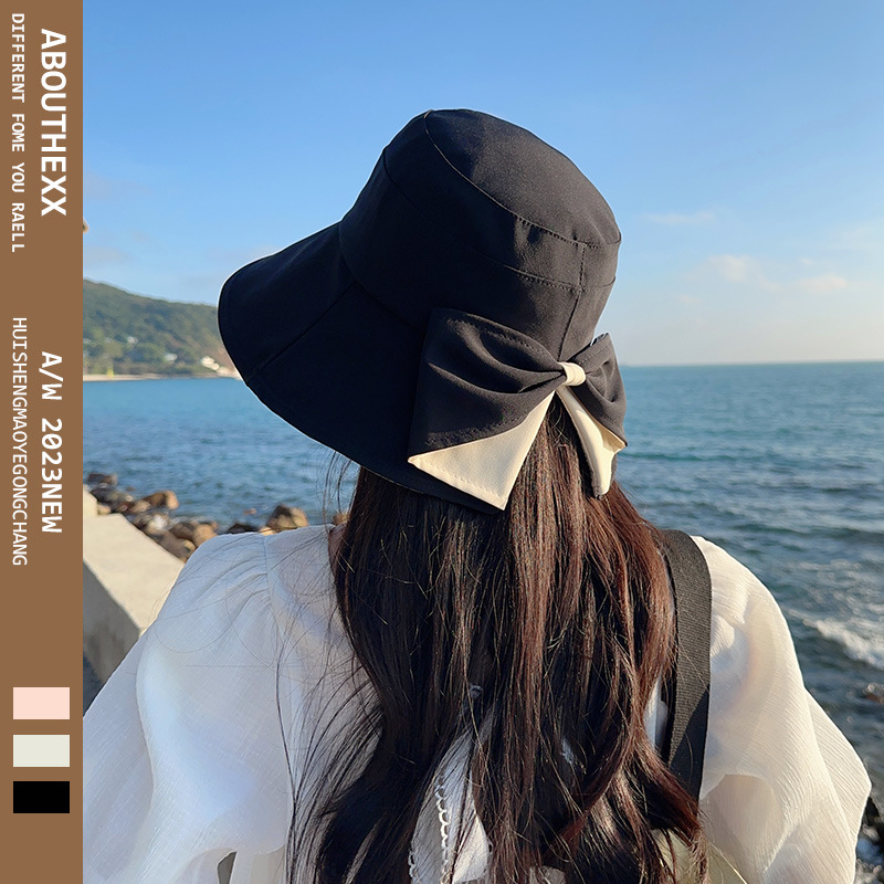 夏の黒いゴムの蝶結びの日よけの帽子の女性は紫外線を防ぎます。