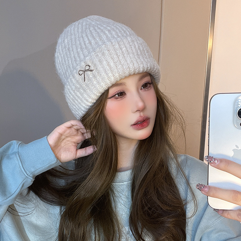 韓国の甘い蝶結びの帽子の女性の秋冬の毛糸の帽子の大きい頭の周りの百合の保温の耳の顔の小さいニットの帽子