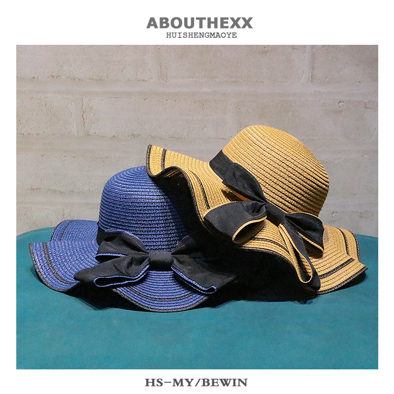 麦わら帽子の女性の夏の韓国版の通気性の大きい軒の日よけの日よけの帽子の波の辺の蝶結びのビーチ帽子の子供の海辺の潮
