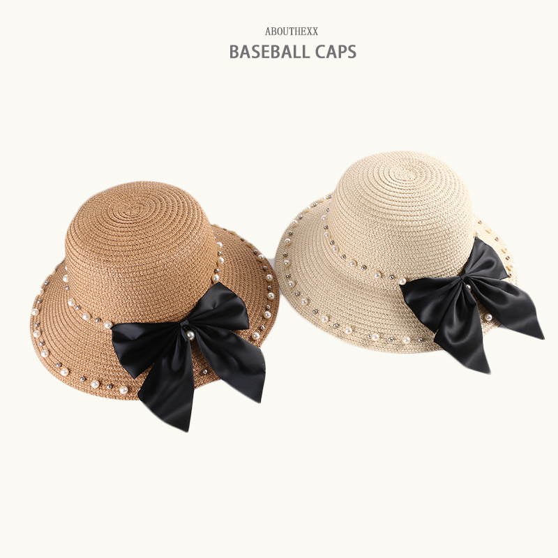 帽子の女性の夏の真珠の辺の砂浜の帽子の韓国版は蝶結びの麦わら帽子の女性のレジャーの休暇の日よけの日焼け止めの帽子を編みます。