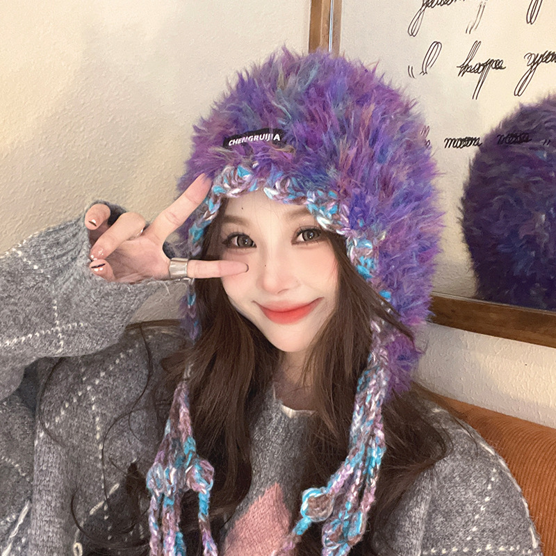 虹のフリンジの毛糸の帽子の女性の保温の民族の風の耳の帽子の冬の屋外は顔の小さい甘いニットの帽子の潮を現します。
