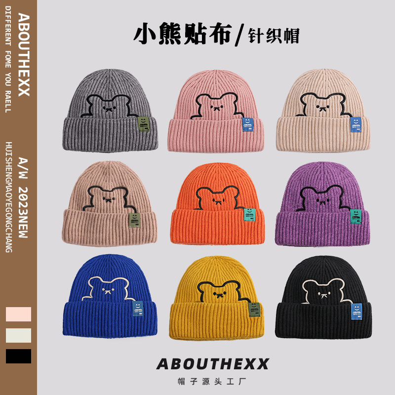帽子の女性は秋冬にかわいいベアー刺繍毛糸帽を合わせて耳を保護します。